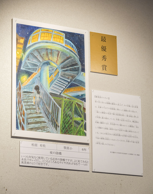 はじめてのコンクール挑戦で最優秀賞を受賞した柏原さんの作品『夜の陸橋』について、審査員の先生方は「これまでに見たことのない世界」と絶賛。色鉛筆を何度も塗り重ねた粘り強さを感じる作品は、紙がピカピカになるほどの熱量で描かれていました。