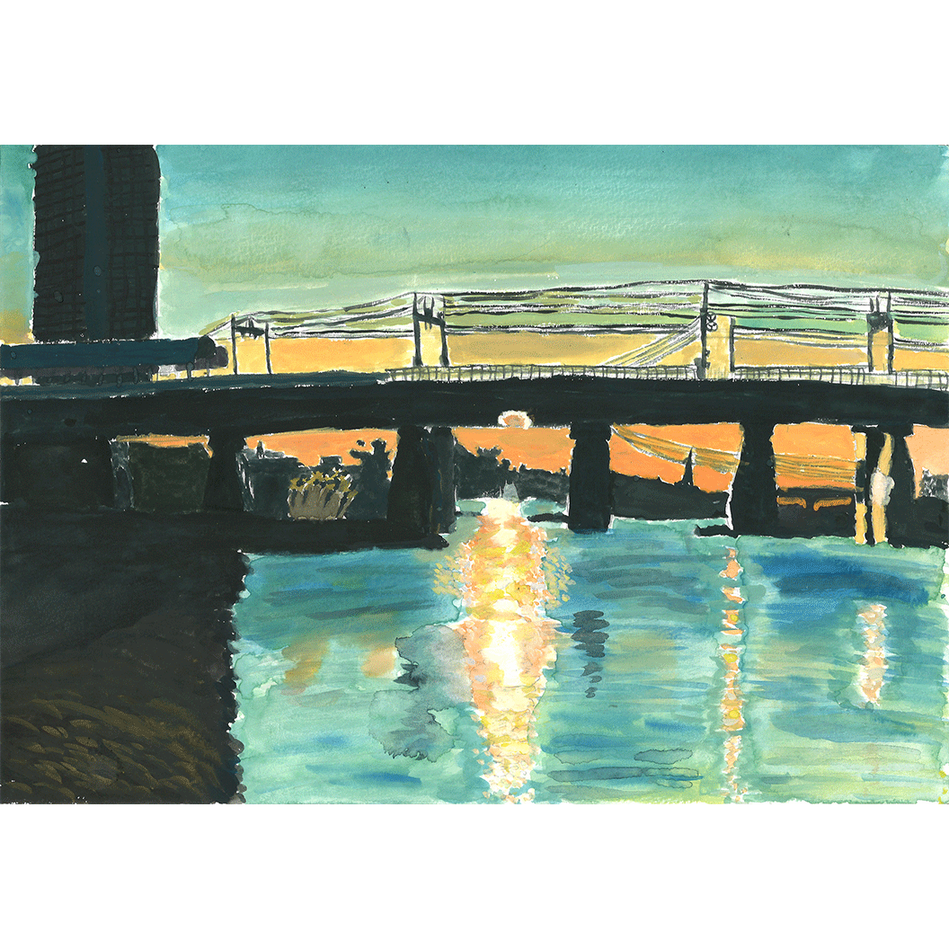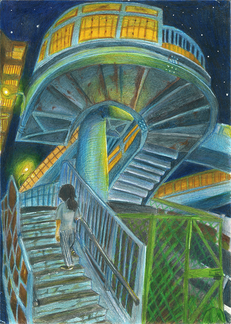 夜の空に浮かぶ陸橋を裏側から見上げ、その対象に迫る表現は、見事で今までの絵画展に無かった感動を呼び覚ます。一般には薄塗りの色彩で描く色鉛筆を使い、強く画面に押し付け何度も重ね描きしている。作者の追求の仕方は、構造物を的確に観察する目、存在感やその置かれている環境を一体として理解する頭脳、納得するまで追求する腕と身体からなっている。これらが統合された創造性豊かな作者の追求の仕方は、今後の展開と成長につながっていくだろう。作者の今後の追及と研究が楽しみでならない。