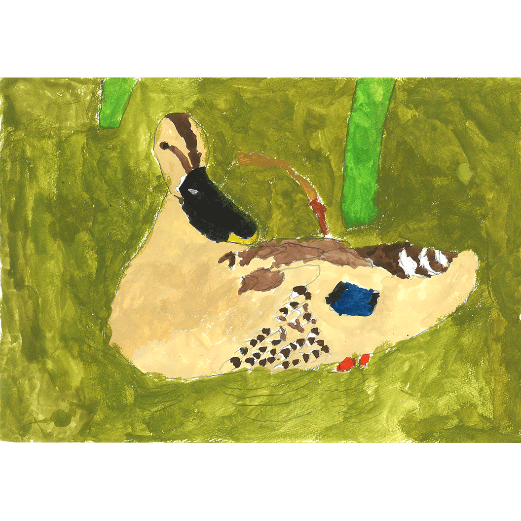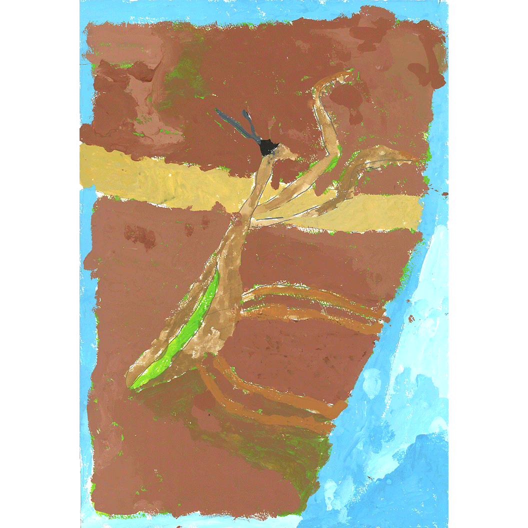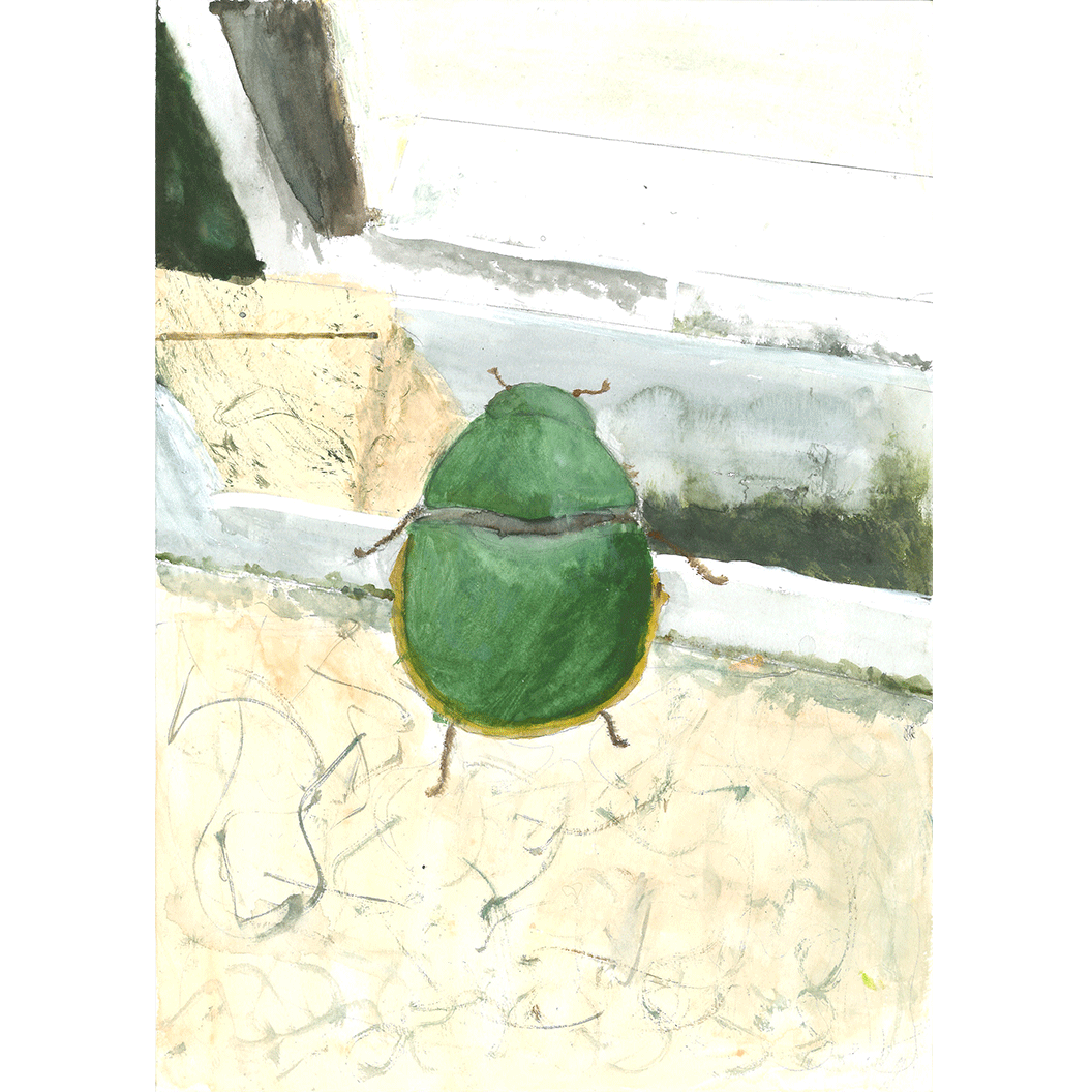 良くこのカナブンだけを主題に挑戦しましたネ。虫がいる場所も中心より丁度良い所にズラシて描かれている。それによって動きが出てくる。大人でも表現出来ない画面の構成。色彩の省略、筆づかい。ボカシ、美術大学の生徒に近い絵。