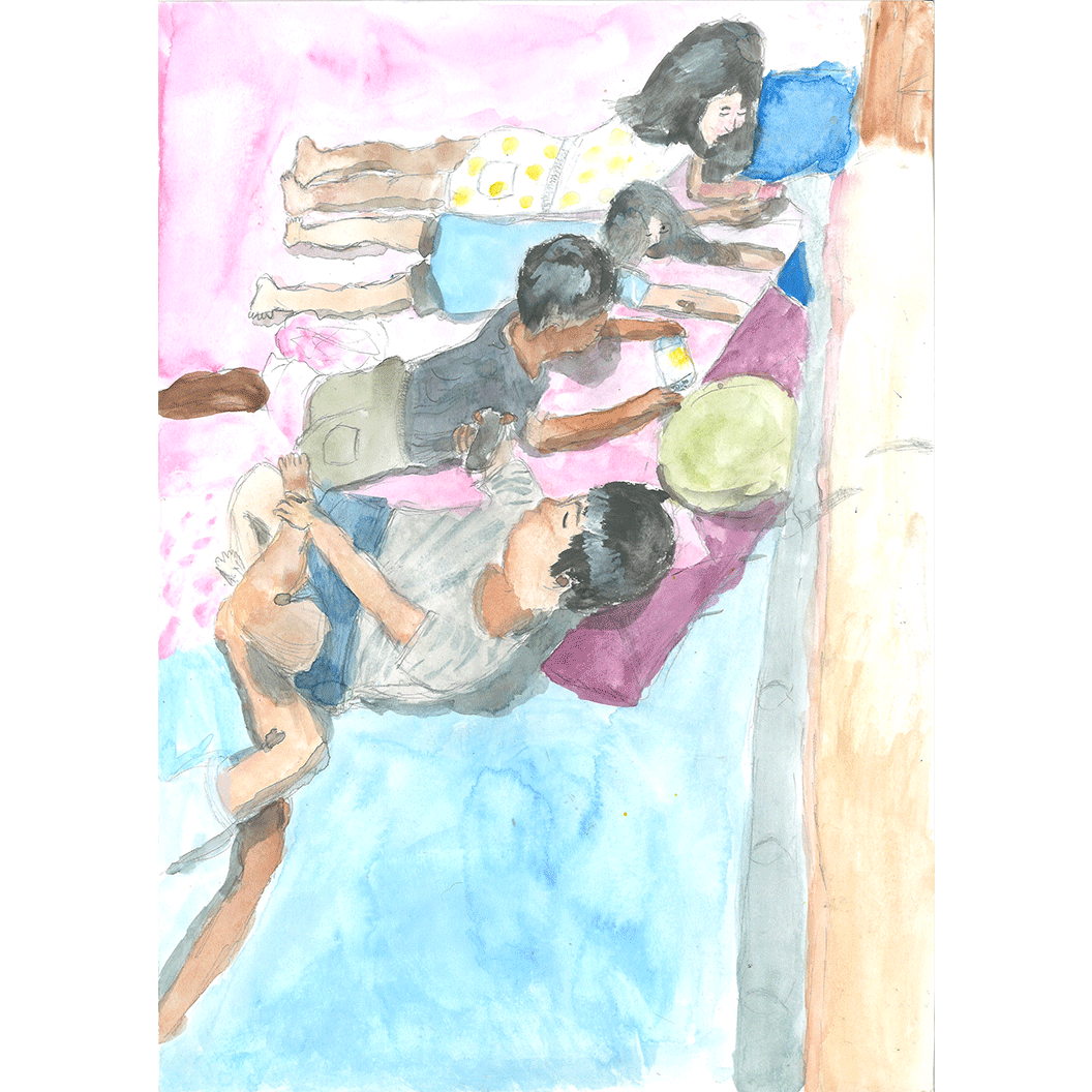みんなが寝ころんでいる床の部分の色のつかいかた、水彩絵具の持ち味をいかした表現もすてきです。とても、だいすきな作品です。