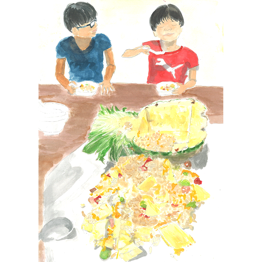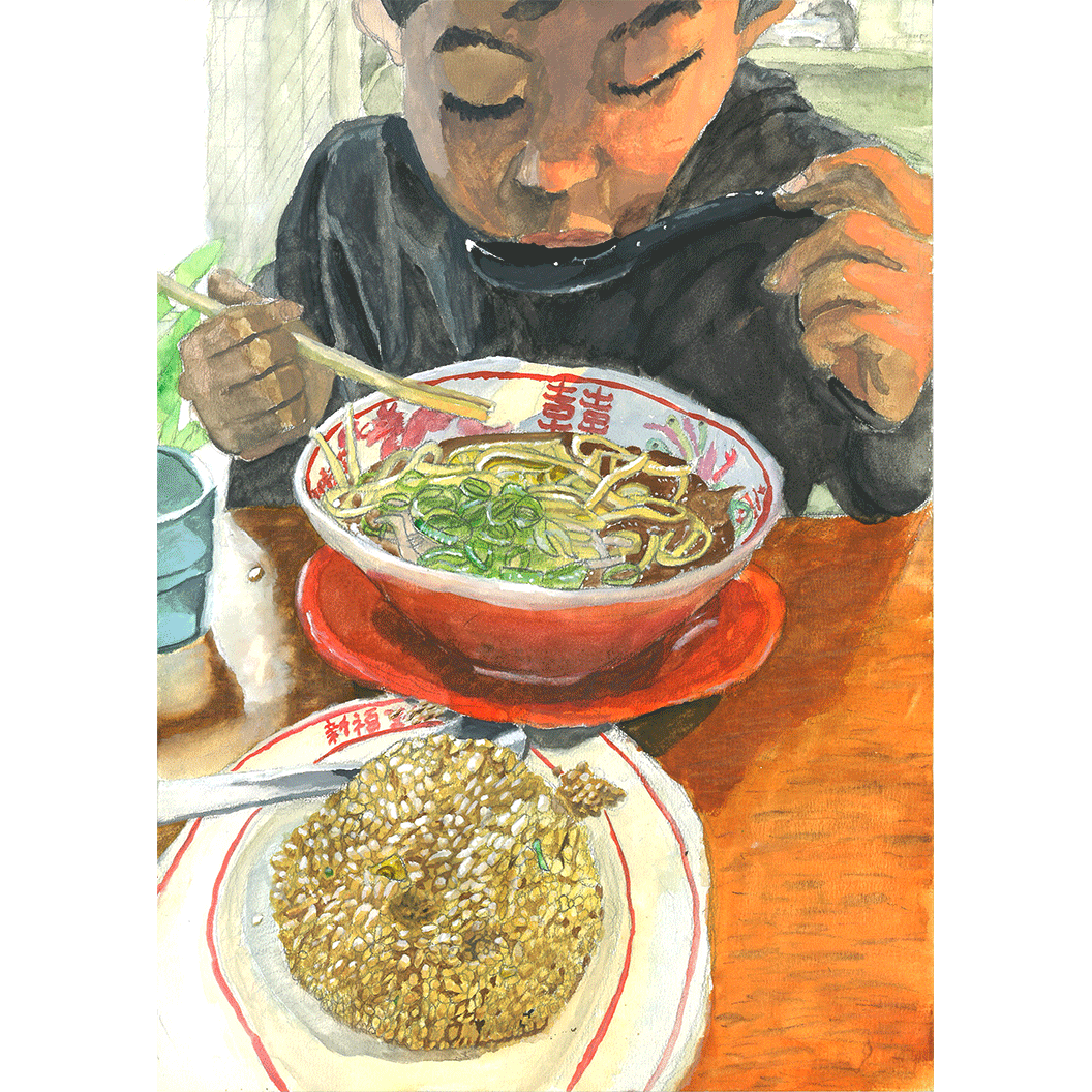 美味しい匂い、味、熱さ、満足感がこの画面からこちらに飛び出すように伝わってくる。スープの中の中華麺の様子、大盛りのチャーハンの飯粒、そしてそれらの器の表現の追求は見事である。この絵を見ていると生つばが出そうになるほどの描写力だ。