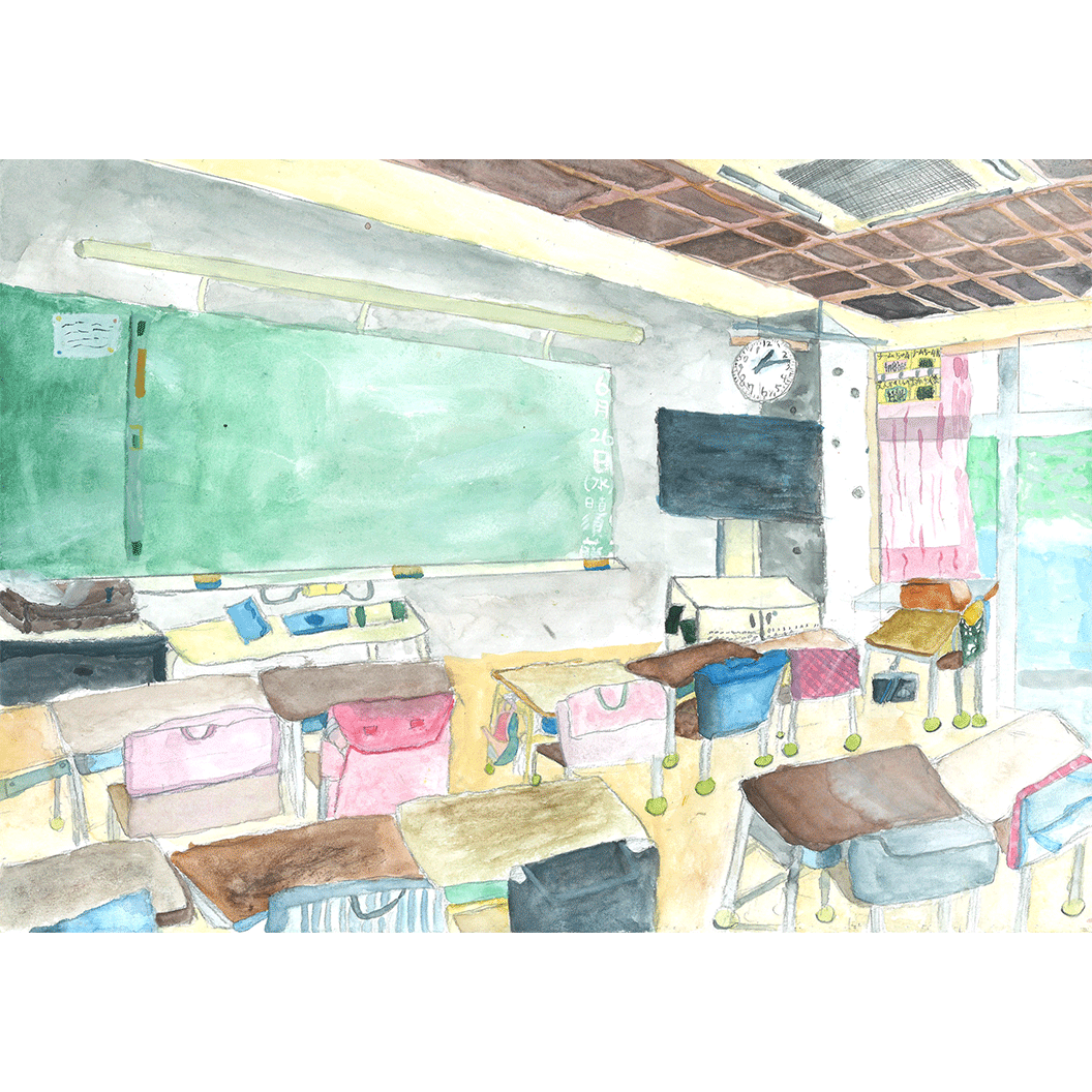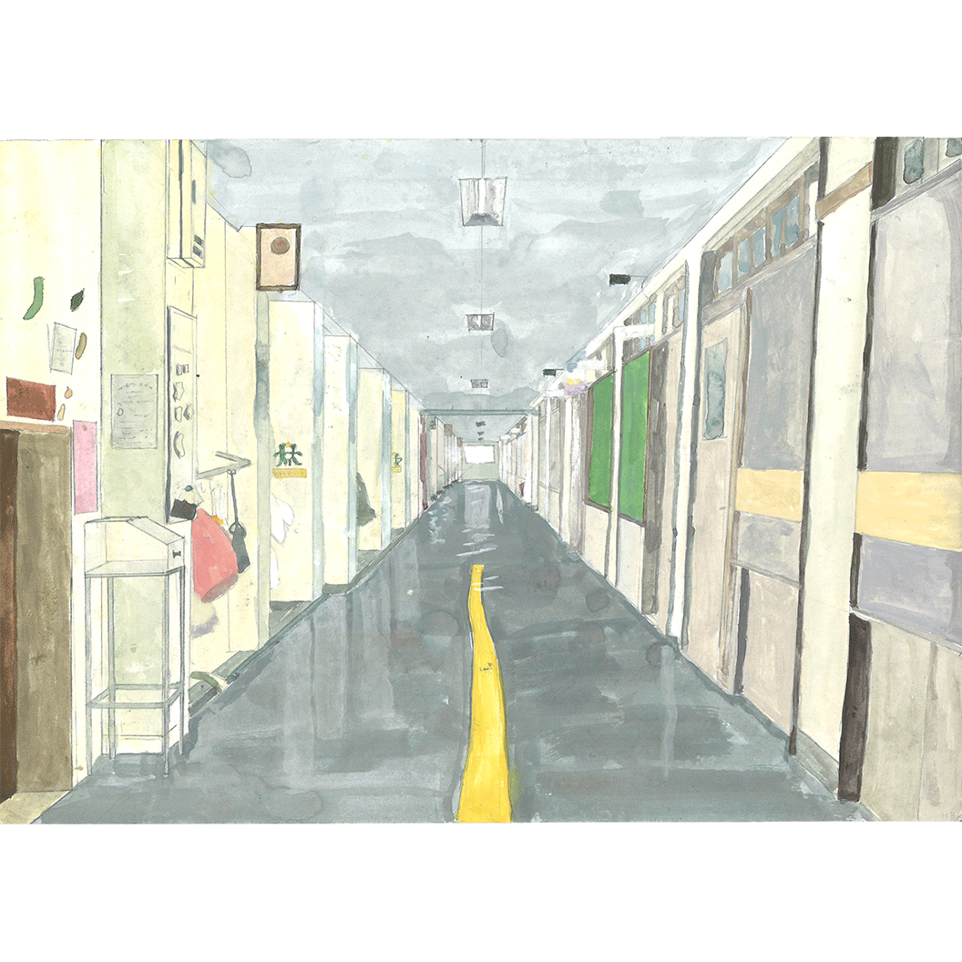 学校の廊下を遠近法で描き、画面の中心に消失点(視線が無限に向かって収束する点)がとられている。誰も行き交わない静かな廊下の、先の先には描かれてはいない未来があるようだ。作者にとってのタイムトンネルなのかもしれない。濁りのない明るい色彩による「素晴らしい空っぽ」を見事に描いた優秀作品だ。