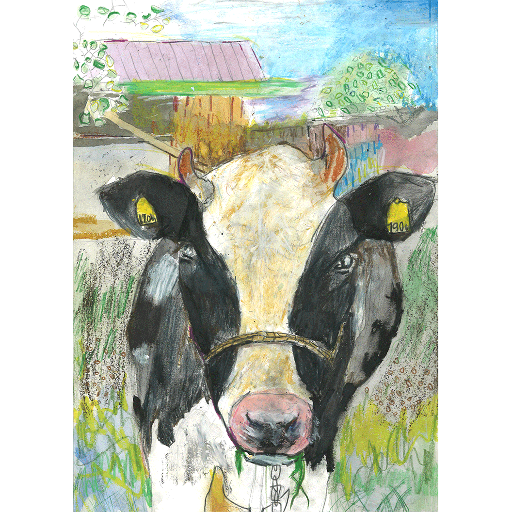 まずとてもインパクトがあります。そしてコメントにある、「こっちにおいで」と言ったら本当に近づいてきてびっくりした。という様子の情景が、描かれた作品を見ているこちら側が体験しているくらいよくわかる作品です。なぜこんなに牛さんの迫力を感じるのかというと、技法で言うとみつきさんの目で見ていて一番近い牛さんのお鼻やそこから目にかかる部分をよく描いていて眉間の毛のうねりなんかもよく描いているからです。牛さんのお顔以外をざっくりと描くことで、牛さんの顔がよりひきたって「ぐいっ!」と近づいている感じがします。また背景の色使いも爽やかで嬉しい近づきであることがわかり、動物に対する温かな気持ちも感じ取れます。色彩感覚もとても豊かだと思います。
