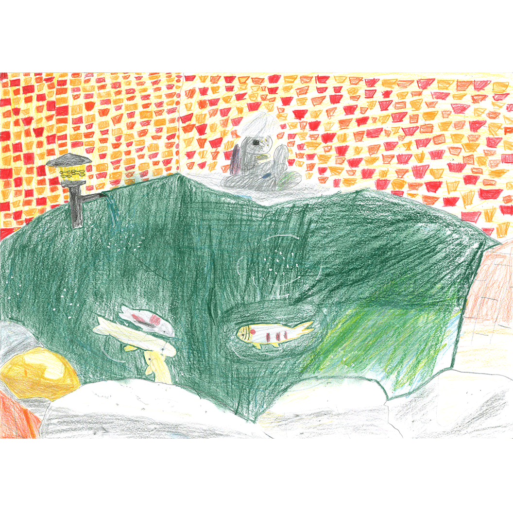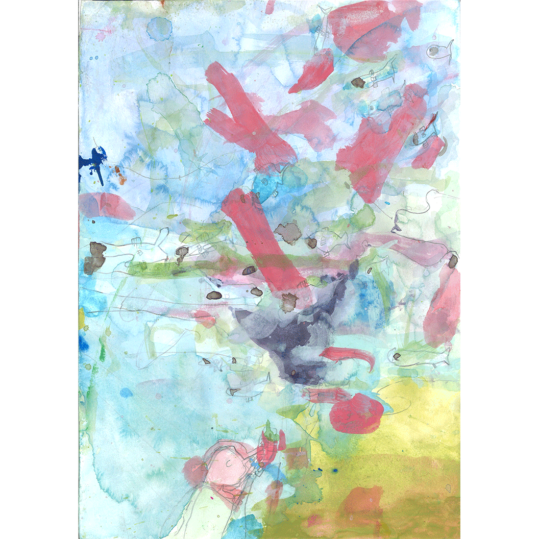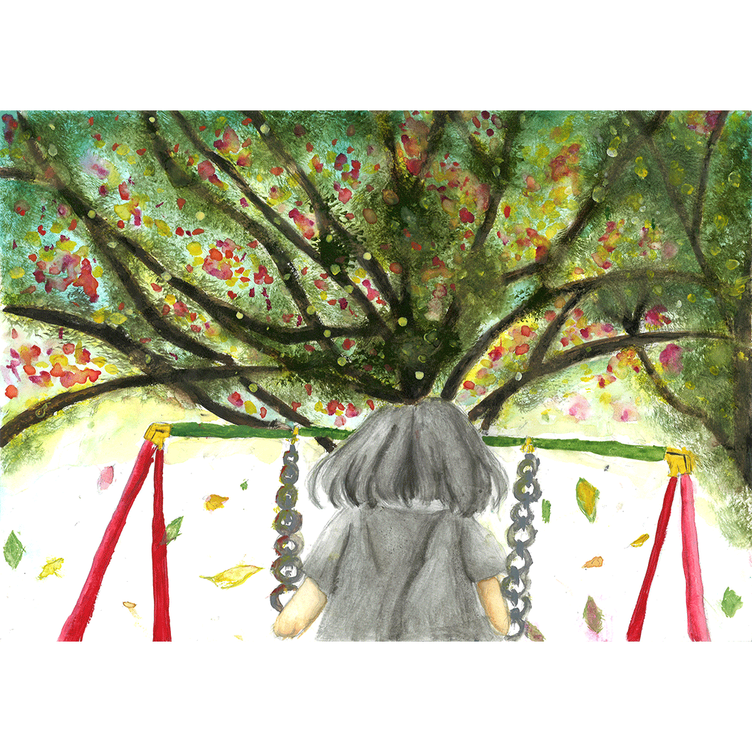 ブランコが大好きなんだね。しかも目をつぶって、ブランコをこいで、目を開けた時の光が入る瞬間の景色が好きだなんて、とっても素敵な自分だけの楽しさを見つけたんだね。でもいつ目をつぶって、いつ開けるんだろう。ここからは君の絵を見てそのことを想像してみます。ブランコをこいで前に行ったり後ろに行ったり、この絵はうんとこいで(目をつぶりながら?)、もっとも後ろに行った時、そう、その瞬間って無重力になるというか、ふっと重さも感じなくなって、それまで揺らいでいた髪の毛も、もちろん景色だって止まってしまう、その一瞬を感じます。ちょうどそのタイミングで目を開けると、いっきに景色が現れて、ブランコは前に進みだし、その景色に自分が飛び込んでいく。そんなふうに見えました。でも、君の前に広がる風景は、目をつぶっていたときに想像していた、もっともっと大きな世界を感じます。ここに描かれている樹は、夜空の銀河系のようにも、あるいは生命の中の細胞のようにも見え、そしてそれも君自身から生えているように、世界と君が一体となった、とても壮大なシンフォニーが聞こえてくるようです。でも、目をつぶってのブランコは、ちょっと危ないので、しっかりブランコのチェーンをにぎって、大人の人といる時にしてくださいね。これはお約束です。