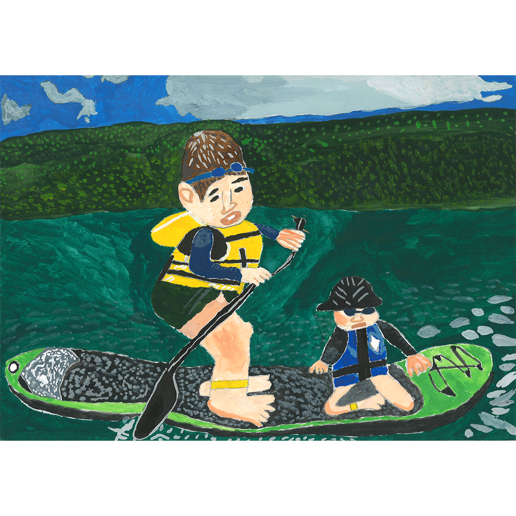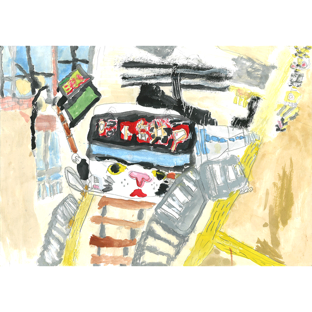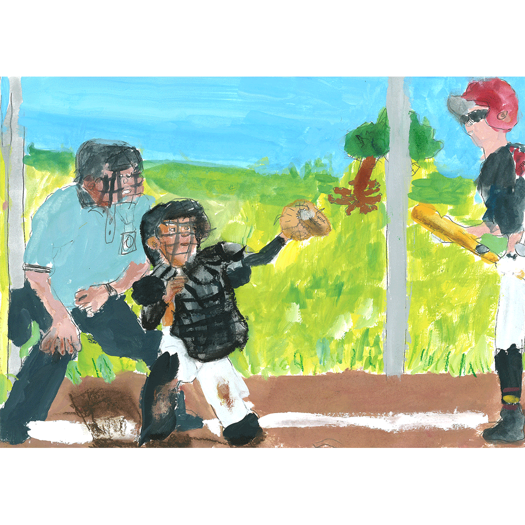 ブランコが大好きなんだね。しかも目をつぶって、ブランコをこいで、目を開けた時の光が入る瞬間の景色が好きだなんて、とっても素敵な自分だけの楽しさを見つけたんだね。でもいつ目をつぶって、いつ開けるんだろう。ここからは君の絵を見てそのことを想像してみます。ブランコをこいで前に行ったり後ろに行ったり、この絵はうんとこいで(目をつぶりながら?)、もっとも後ろに行った時、そう、その瞬間って無重力になるというか、ふっと重さも感じなくなって、それまで揺らいでいた髪の毛も、もちろん景色だって止まってしまう、その一瞬を感じます。ちょうどそのタイミングで目を開けると、いっきに景色が現れて、ブランコは前に進みだし、その景色に自分が飛び込んでいく。そんなふうに見えました。でも、君の前に広がる風景は、目をつぶっていたときに想像していた、もっともっと大きな世界を感じます。ここに描かれている樹は、夜空の銀河系のようにも、あるいは生命の中の細胞のようにも見え、そしてそれも君自身から生えているように、世界と君が一体となった、とても壮大なシンフォニーが聞こえてくるようです。でも、目をつぶってのブランコは、ちょっと危ないので、しっかりブランコのチェーンをにぎって、大人の人といる時にしてくださいね。これはお約束です。