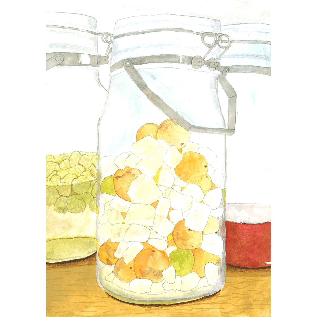 とうめいなガラスビンの中に、しろっぽい氷ざとうと、梅の実がなかよくいっしょにいますね。