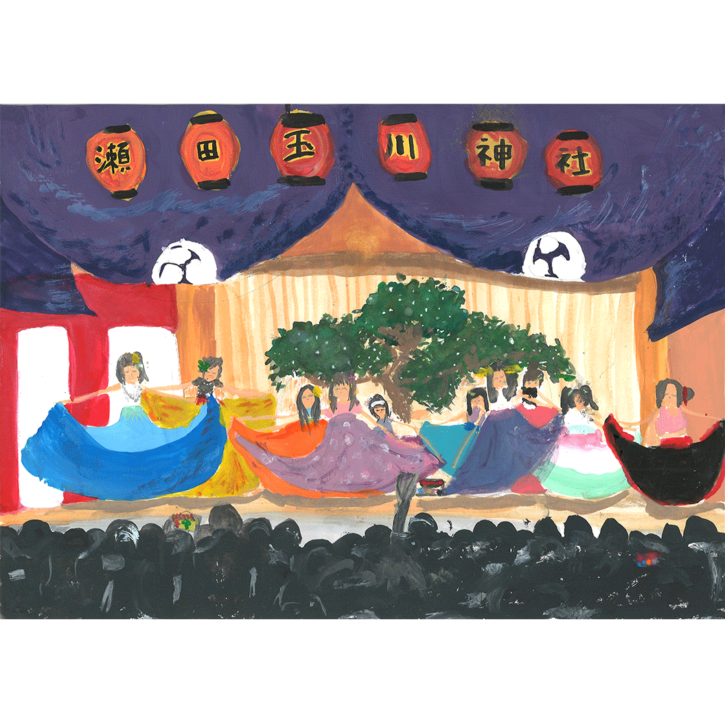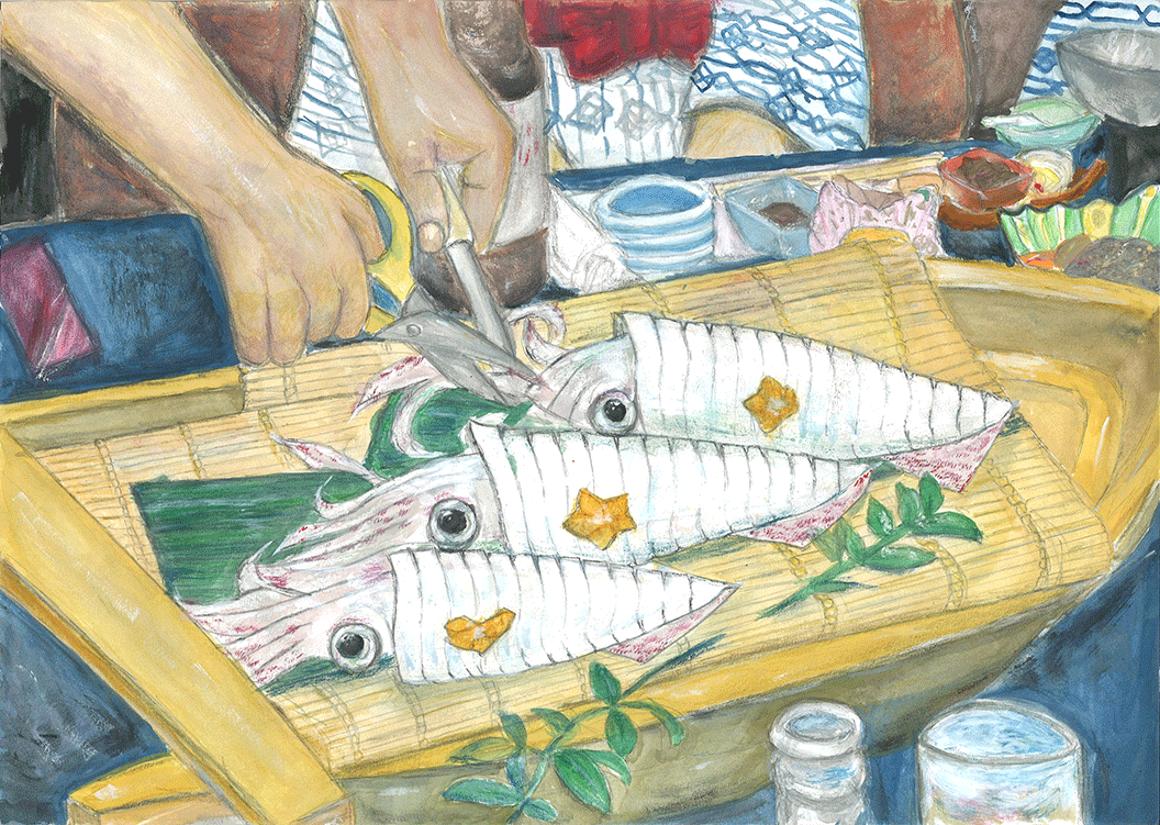 今年は小学校最後なので、おじいちゃんおばあちゃんが住んでいる大好きな佐賀の思い出を描きました。夏休みに呼子で食べたイカはすき通っていて、とてもおいしかったです。
