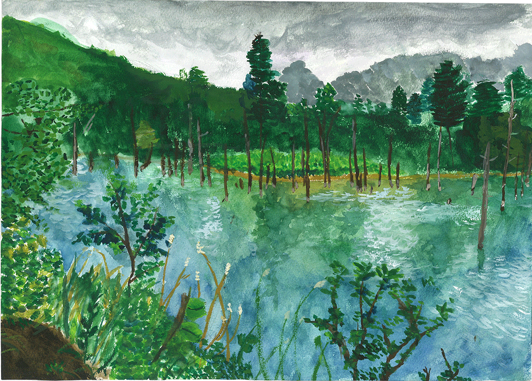 静けさの中に森羅万象の息づかいが感じられます。自然物の表情や質感がとても良く観察されていて水面の質感や風景の奥行きを捉えていると思います。何気ない自然の美しさに心惹かれている作者の気持ちが伝わってきます。