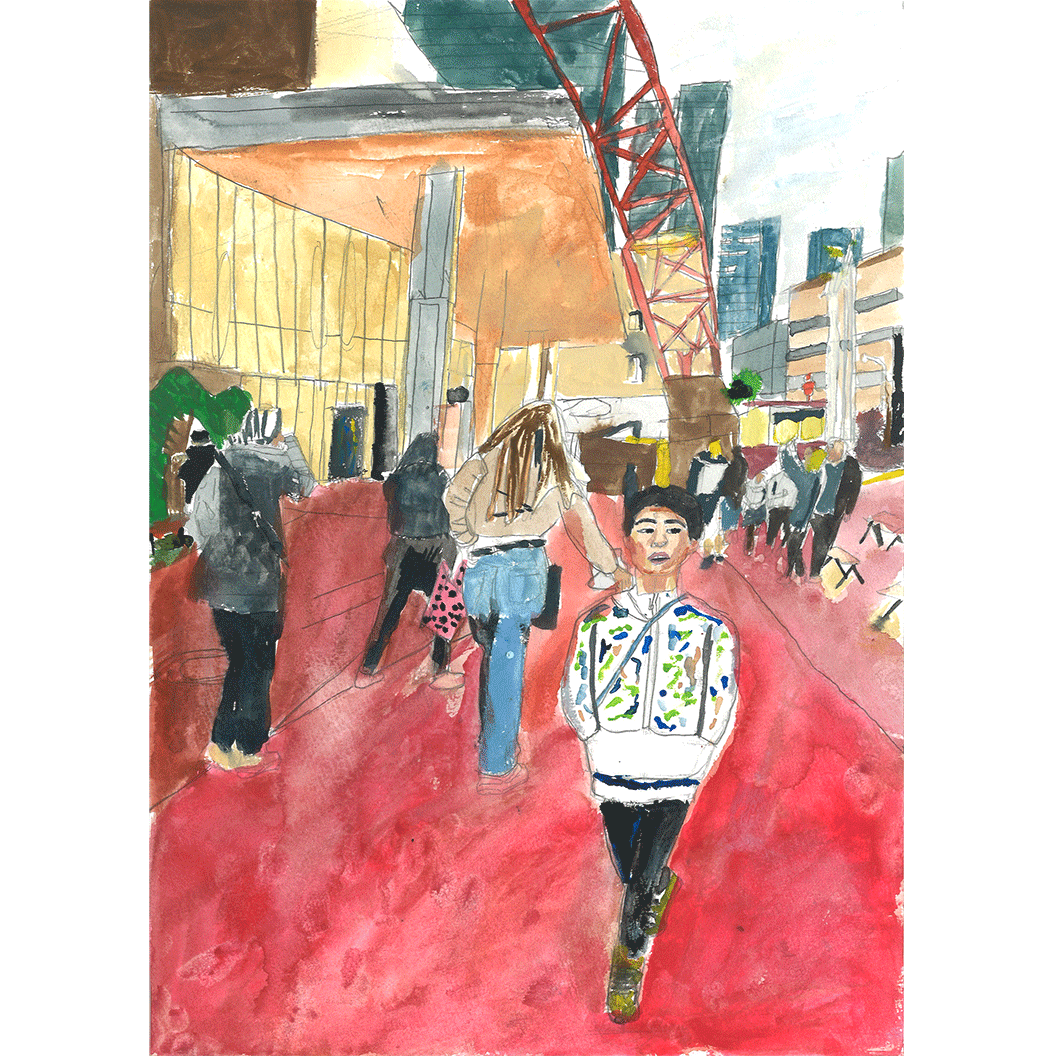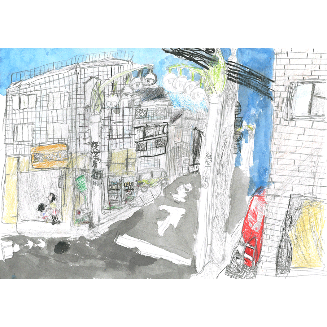 午来君、昨年に続いての受賞。昨年は池のカモ、今年は東京タワーの下での・・・都会的な君の姿かな。街を歩く人のスタイルが大掴みで描かれ、良く雑踏が表現されている。