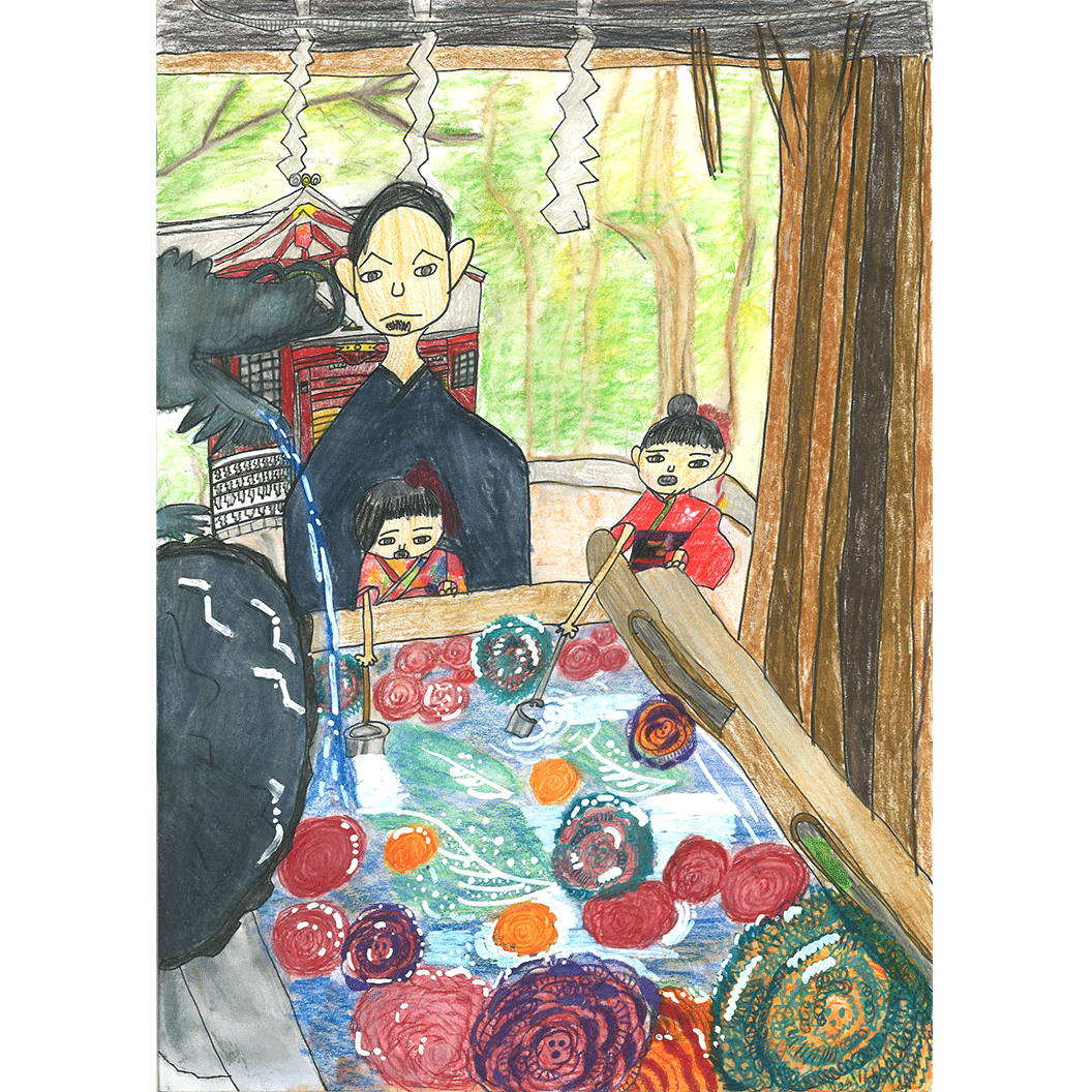 せ田がや八まんさんの“手水や”の花がいつもかわっていて、とてもきれいだからまた行きたくなります。この絵は、七五三のときのしゃしんです。