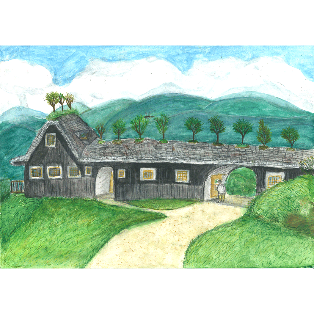 夏休みに長野に旅行に行った時、泊まった宿です。黒いかべと木が生えている銅板の屋根が気にいりました。