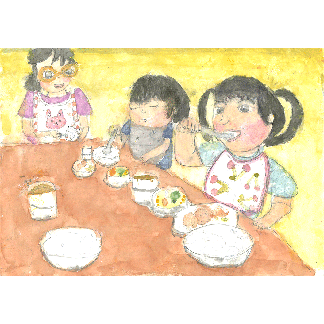 絵のバランスの良い「私」が有る絵。私は見えないし、家族の顔も見えないが食べるのを待つ家族の歓びがあり、このまま大人になっても対象と正面から向かい合う人となって、楽しい人生を送ってください。絵にかぎらず。